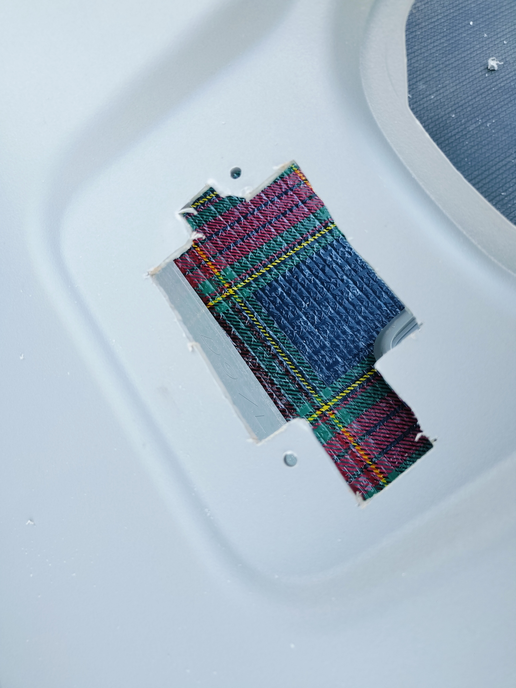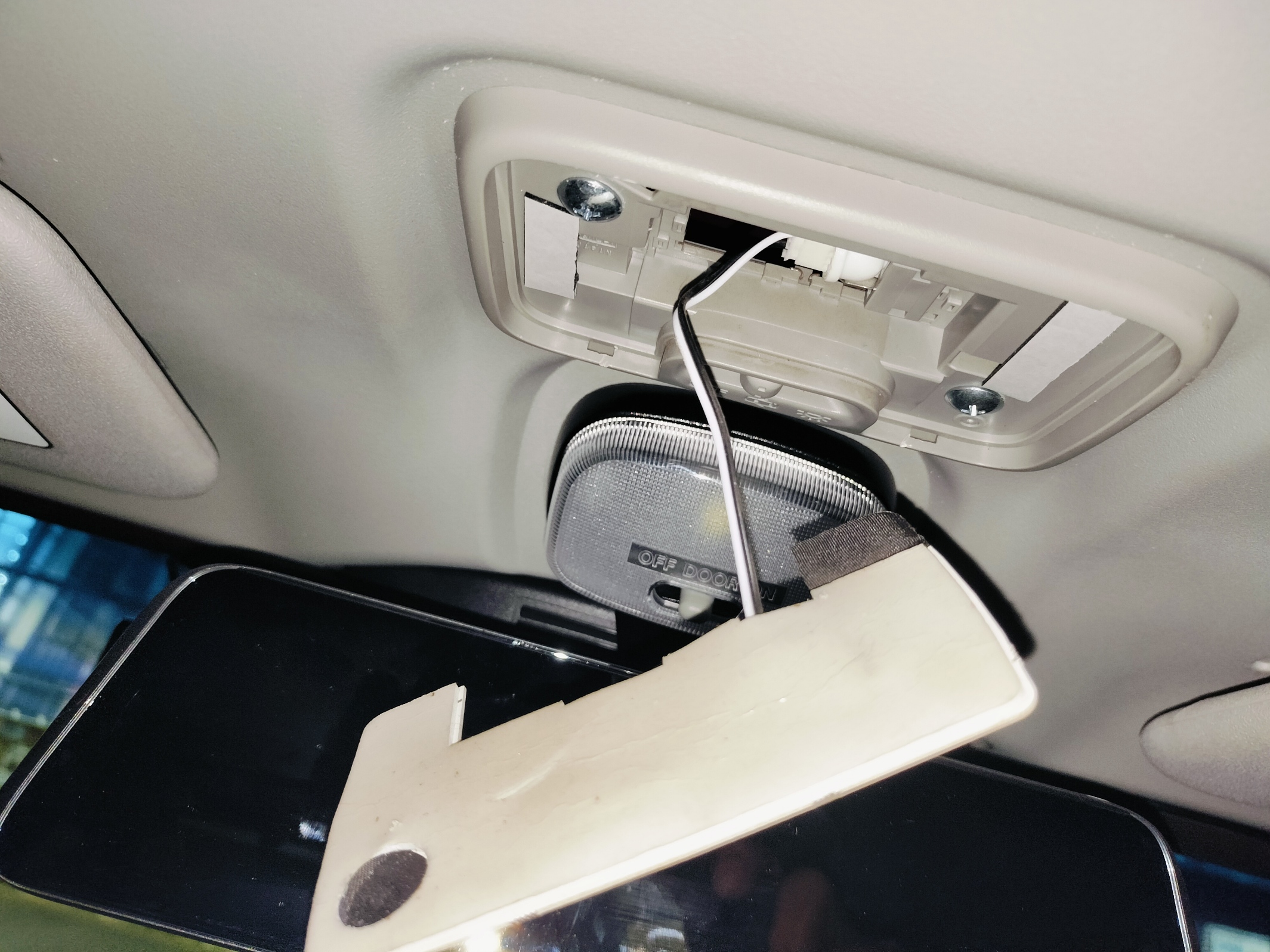 オーバーヘッドシェルフを外すと、そこには大型ルームランプ用の切り取り枠が刻印されていました。この瞬間、「これ絶対ビンゴ!」と確信。